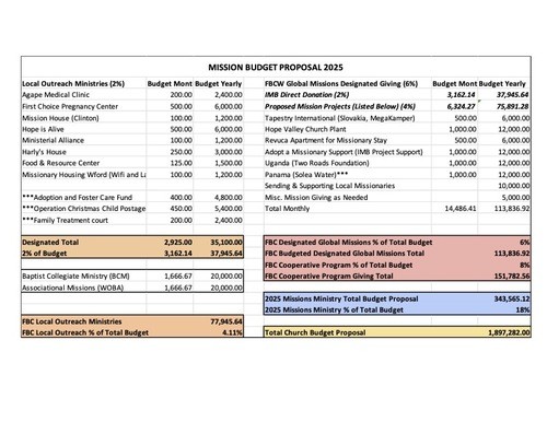 First Baptist Church is incredibly giving. 18% of the church budget is sent out from the church. As a church we designate 10% of all giving to the Cooperative Program. On top of that we give 4% of our overall budget to global mission partners and projects. This means over $125,000 goes directly from FBC Weatherford to the nation and the world for missions ministries.